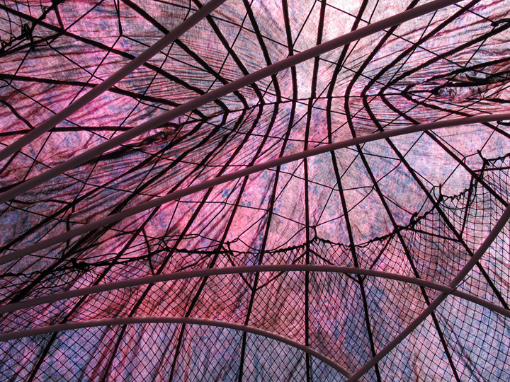 I created the Resticles for Burning Man.A few years ago I created BreastStop, a similar artwork with two smaller trampolines, and two not-dyed parachutes (they arrived pink from the surplus British military)