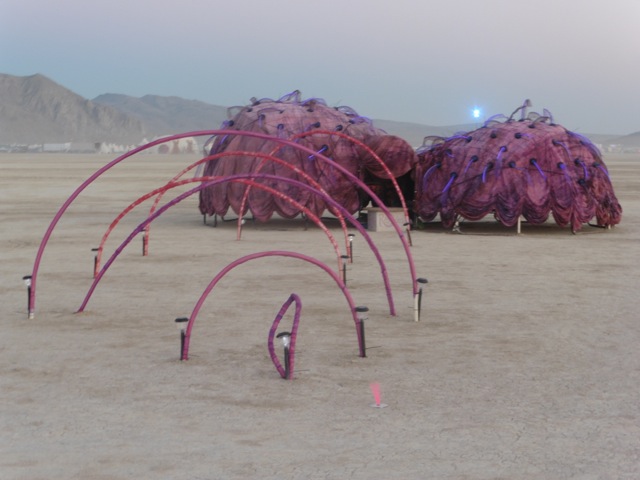Correction, not caterpillar; balls. Two huge testicles, dubbed “Resticles.” We crawled inside the giant genital orbs and “hung out” in the lower sack for at least 2 hours. The scrotal skin, a dappled purple and pink, shimmered beautifully above me. Goddamnit, my first deep playa art was a gargantuan pair of bollocks and I really fucking loved them. I returned to this installation at least two more times during my burn…