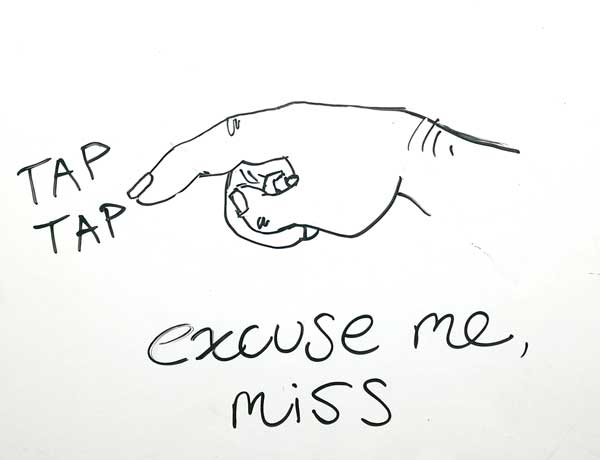 3. If I can’t hear you (due to environment, deafness, or otherwise)…? Just tap me on the shoulder. Tap tap. There’s a reason why the next thing that popped in your mind was a very polite, “Excuse me miss?” — because polite people put shoulder-tapping in the manners rulebook long ago and manners are really just about choosing actions which should make the most people as comfortable as possible.hand-tap-tap-on-the-shoulder-excuse-me-miss